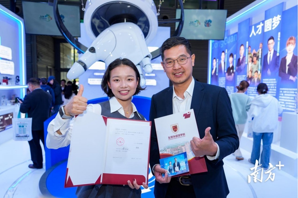 招聘现场,东莞“引才力”十足,不少优质人才现场签约——毕业于清华大学的袁玮荩接收了东莞湾区中学抛出的“绣球”,将在东莞这片热土上投身美术教育事业;来自浙江大学畜牧专业的程洪与东莞外国语学校“结缘”,欢迎更多学弟学妹选择东莞;南方医科大学博士毕业生何子俊选择了南方医科大学第十附属医院(东莞市人民医院),将继续在东莞奋斗。